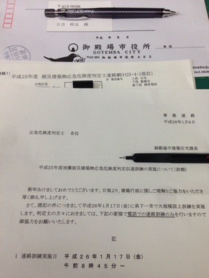 訓練の中で、応急危険度判定士の連絡訓練があるそうでして、その参加依頼を御殿場市よりいただきました。